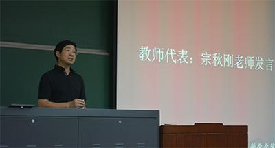 宗秋刚教授作为教师代表发言。宗老师首先强调,在大学里不单单要想“我们要成为什么样的人”,更多的是要考虑“我们要怎样成为这样的人”。宗老师提醒大家过去的成绩已经成为历史,从今天开始所有人同属于北大,属于地空;所有人都应将自己的征途定为星辰大海,胸怀远大的理想,不计一时的得失,即使暂处波谷也不要忘记追求巅峰。最后宗老师期盼大家能在大学的学习过程中培养自己的学习能力、独立思考能力和自控能力,珍惜美好而短暂的大学生活,真正实现自己的理想。