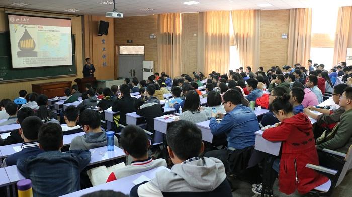 19日上午,讲师团来到中国地质大学(武汉)地球科学学院,受到师生热烈欢迎。讲师团成员向在校大学生进行科普教育示范课程宣讲。2014级地质学专业本科生尚昊成通过平日所学和积累,描绘了一幅生动形象的海洋岛屿的壮丽图景。2015级地质学专业硕士生赵炜以围绕石油资源而展开的当今国际大国政治博弈为切入点,从基本定义、形成机理、埋藏位置和勘探开发方法等方面系统讲解了石油科普知识。中国地质大学(武汉)地球科学学院四个年级近200名本科生聆听了讲师团的报告,并对讲师团的精彩授课报以热烈掌声。