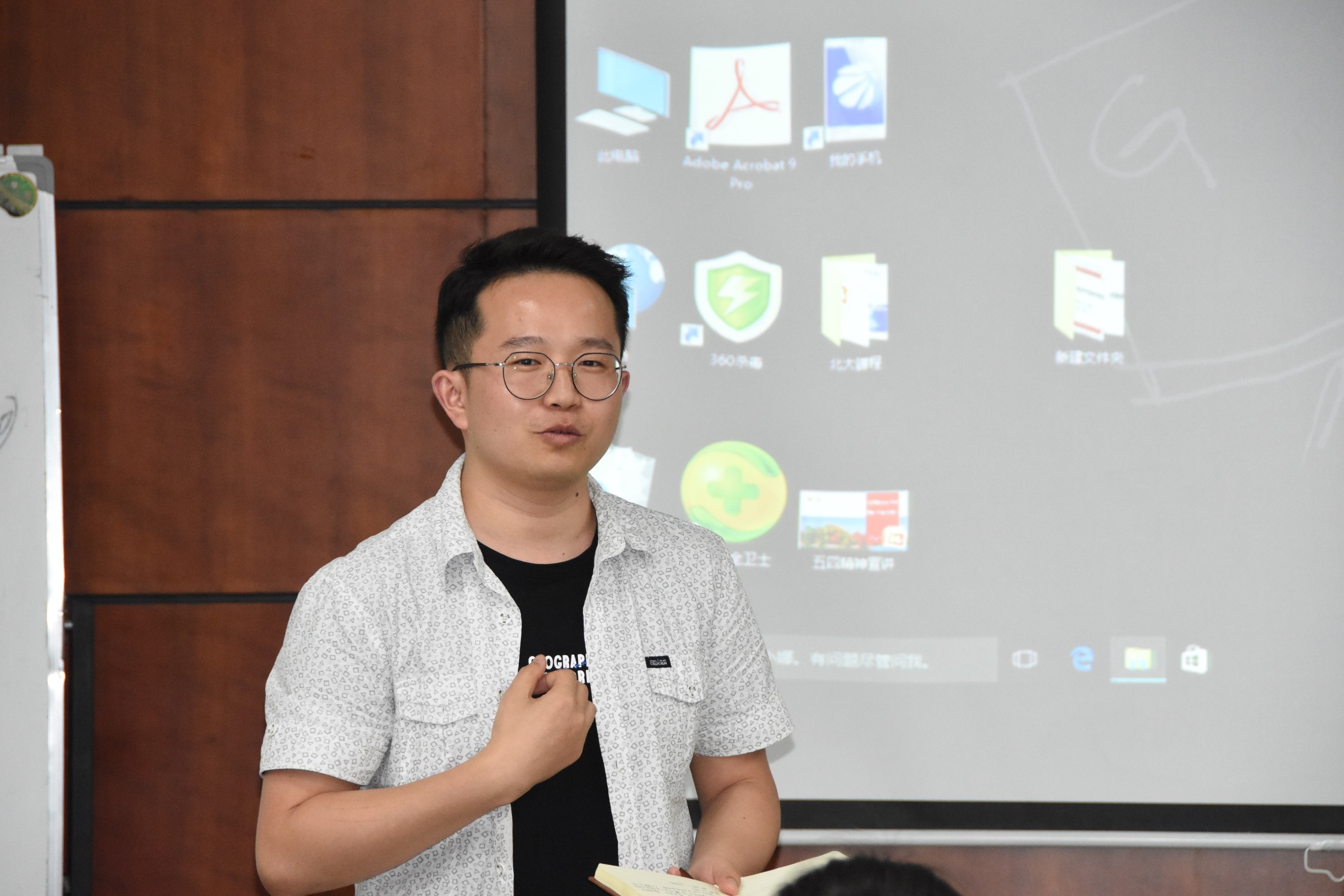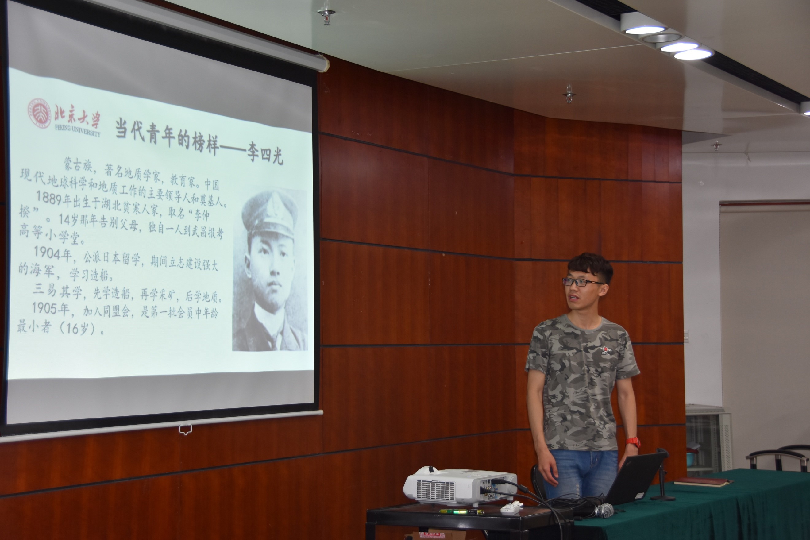 地质系教授李四光的生平事迹为例,讲述了“爱国、进步、民主、科学”的五四精神在李四光先生身上的体现,号召大家向他学习。