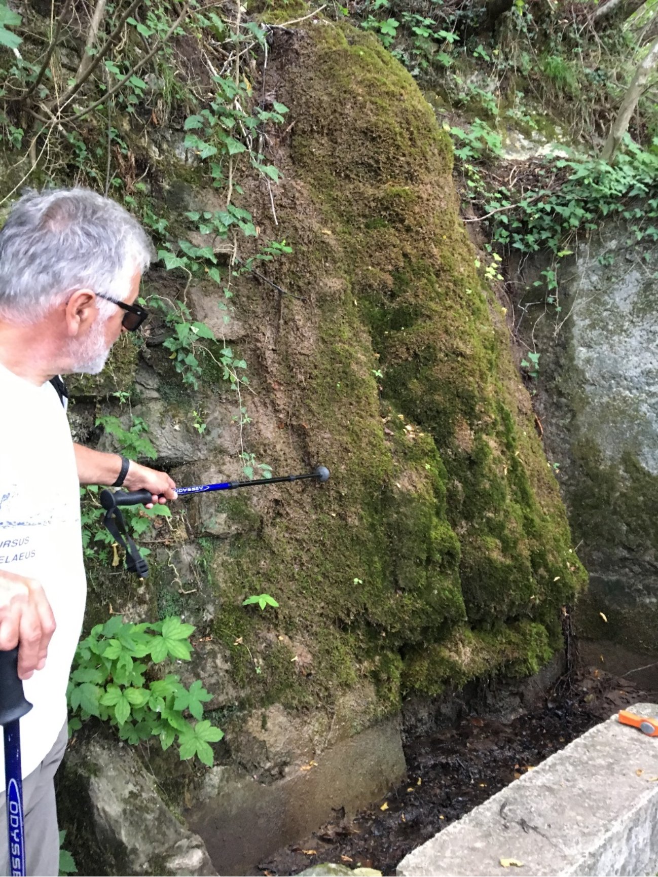 第一个引起同学驻足的点是现代碳酸盐岩沉积——钙华。由于岩性的不同,地表径流渗透经过易溶蚀的碳酸盐岩岩层后,因下伏的火山岩致密紧实,且不易化学溶解,水流无法下渗,因而逐渐积聚,并从断口流出,形成山涧。由于二氧化碳分压减少及生物微生物等复合作用,碳酸盐重新析出,在泉口之下逐渐积聚,形成钙华。