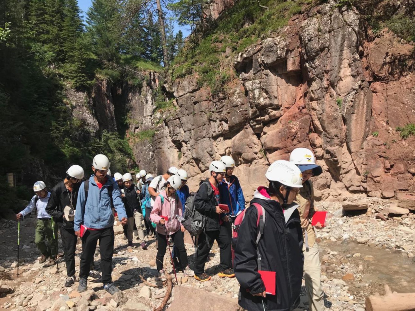 意大利时间7月13日,在AndreaTintori教授和向导Werner的带领下,实习队转场对Bletterbach地质公园进行野外考察。公园发育有膏岩沉积、河流相与海相沉积以及浅成侵入岩等。