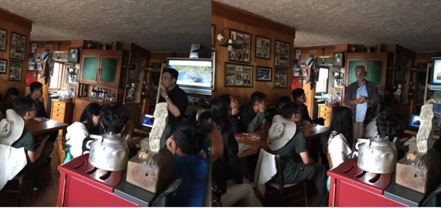 次日,实习队继续在北格里纳山(Grigna)向更高的海拔进发并开展野外工作。受山间大雾影响,实习队止步于海拔1853米处的山间lodge,这一过程中,同学们对南阿尔卑斯地区格里纳山地区三叠纪的碳酸岩沉积台地-碎屑岩沉积盆地有了整体的认知。