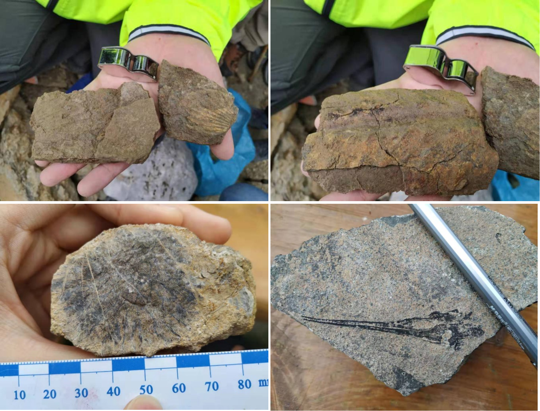 图5.观察化石标本,从左到右,第一列为双壳类,菊石化石(二者具体种类未知,海生,发现于WengenFormation中),第二列为珊瑚(六射珊瑚,台地边缘浅海环境生长),龙鱼化石(AndreaTintori提供,中三叠Ladinian阶海洋生物)