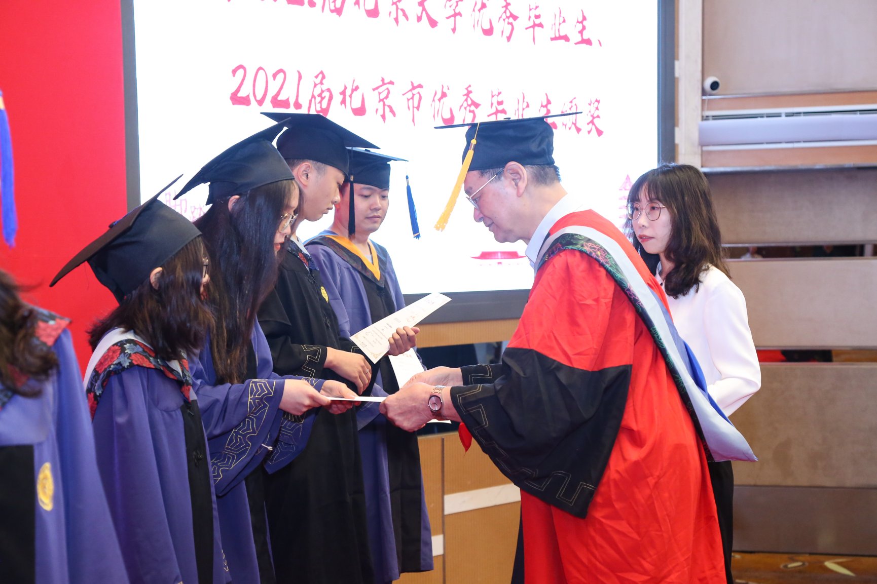 优秀毕业生和2021届北京市优秀毕业生名单后,陈运泰院士、涂传诒院士分别为优秀毕业生颁奖并合影留念。