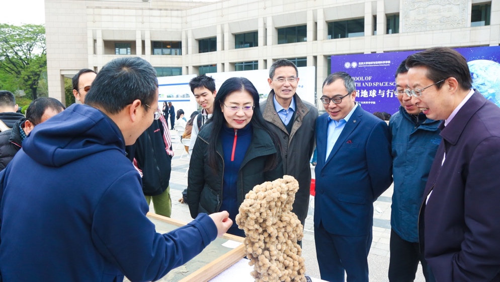 首届地球与行星科学文化周开幕式现场布设地空学院成果展、化石矿石展、天地人文化节等现场活动。江大勇带领与会嘉宾参观展览。