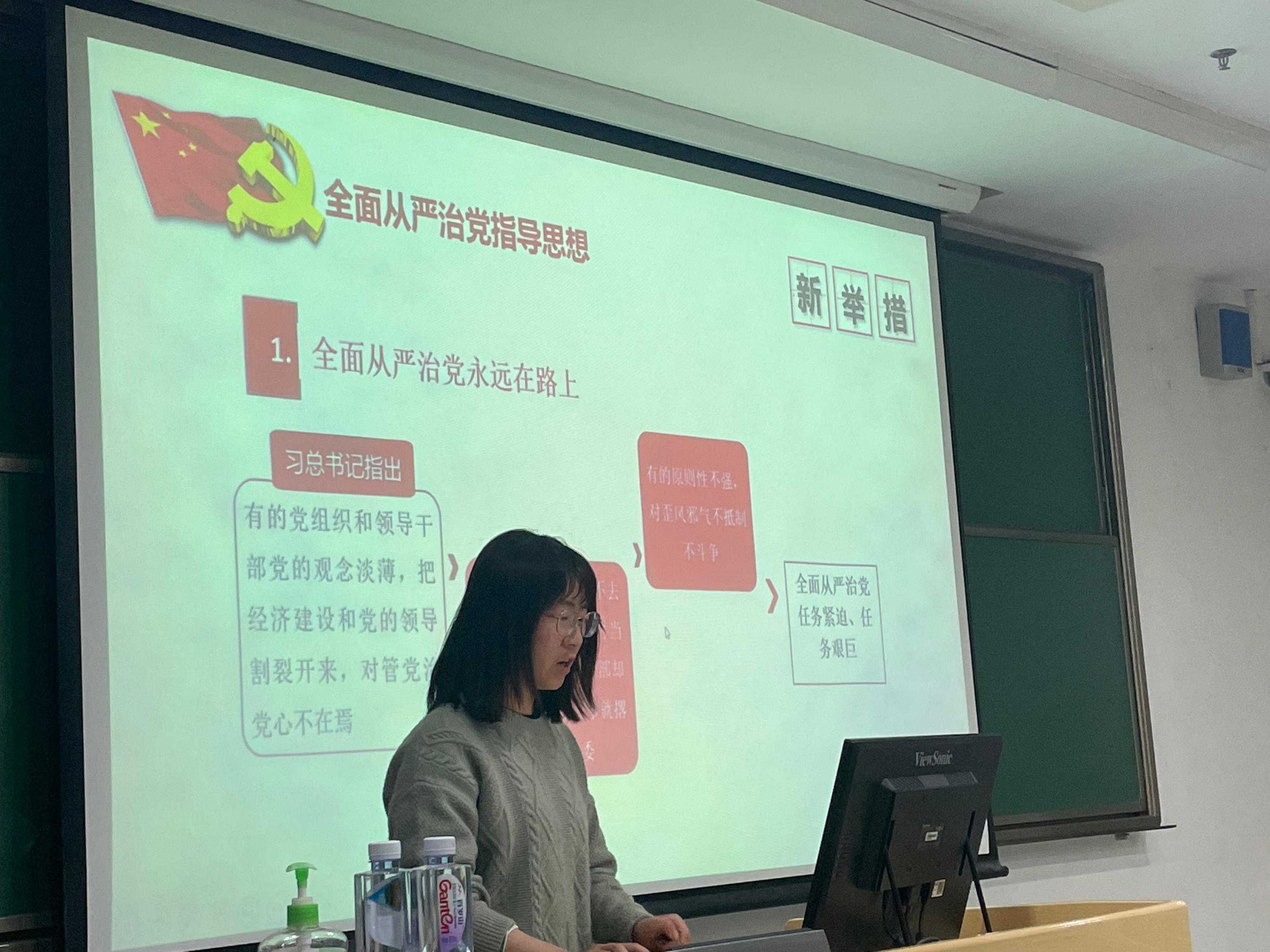 第五组同学分享题为“全面从严治党是党永葆生机活力、走好新的赶考之路的必由之路”,小组成员从全面从严治党的意义、举措、科学内涵及实际案例四个方面展开分享,从理论到北京师范大学党委原书记刘川生、四川省委原副书记李春城的实际案例,培训班成员对全面从严治党有了较为系统、全面的了解。