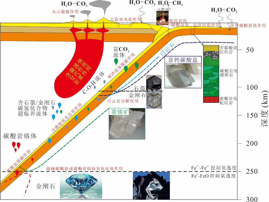 地球的碳循环分为短周期的地表碳循环和长周期的地球深部碳循环,地球整体的碳储量90%以上是赋存在固体地球内部,因此深部碳循环研究对于探讨地表碳循环过程具有十分重要意义。板块俯冲带是连接地表碳循环和深部碳循环的纽带,通过俯冲带可以将地表的含碳物质带到地球深部,因此,板块俯冲带被称为 “俯冲带加工厂”。来自洋壳沉积物的地表碳被带入俯冲带,随后通过俯冲带岛弧火山作用又将部分碳循环到大气中,而残余大量的碳将通过俯冲变质作用进入深部地幔。因此要理解深部碳循环过程,含碳物质在俯冲带变质过程中的物相转变至关重要。
