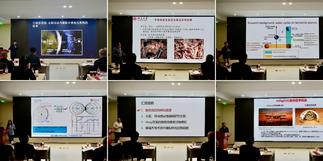 研究中心骨干成员何建森、沈冰、丁峰、乐超、田伟、王彦宾依次作专题报告,报告题目分别为“日球层系统的内外边界层”“太阳佯谬与行星早期宜居性”“贫水类地行星的多平衡气候”“行星磁暴与环电流”“火星与月球熔岩流的火山学研究”和“InSight大震级火星震S1222a的震源研究及构造启示”。