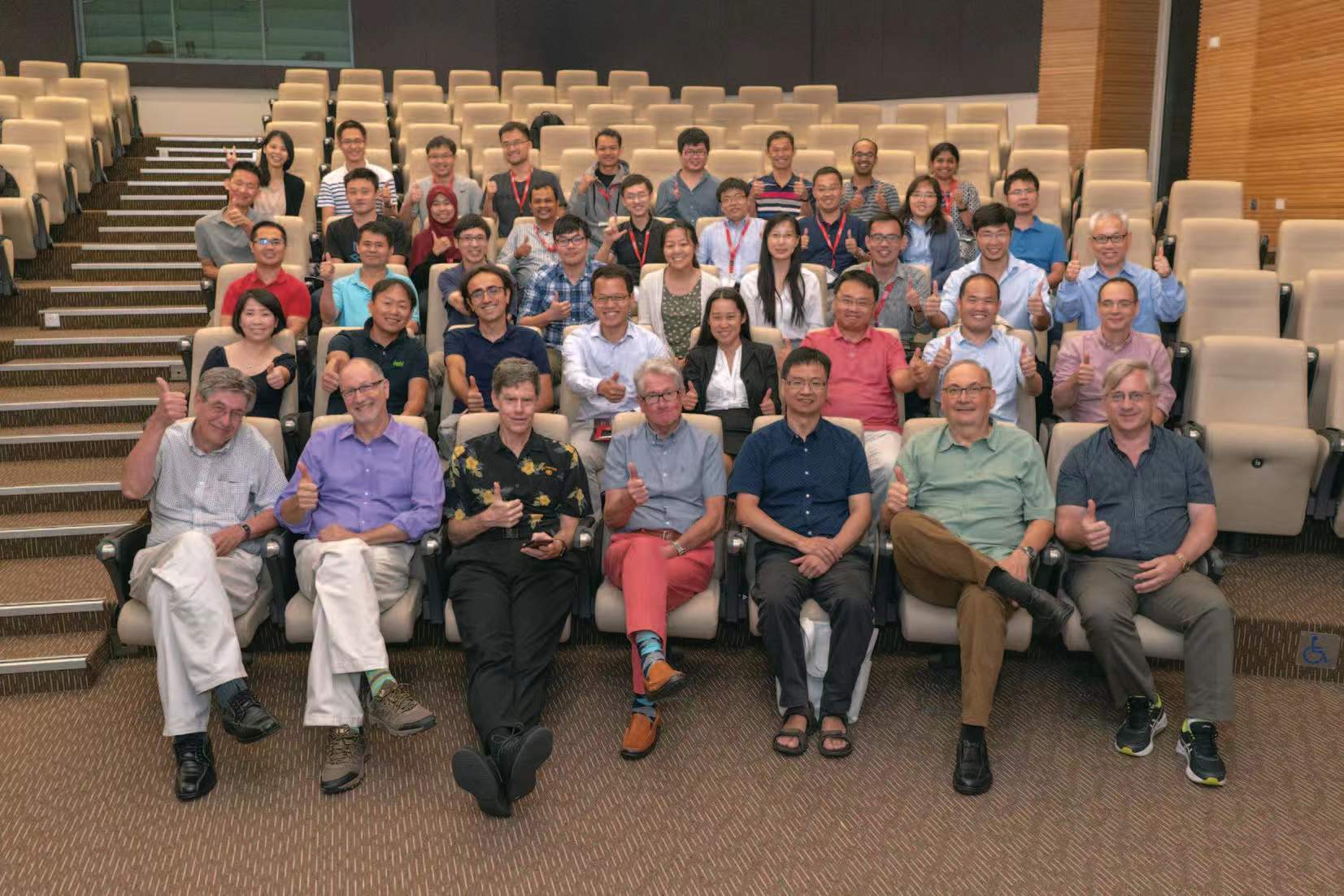 拍摄于2018年8月在南洋行政中心(南洋理工大学)举办的研讨会结束后。第一排左起:唐·亨伯格(第四位),宋晓东(第五位),索恩·莱(第七位)。