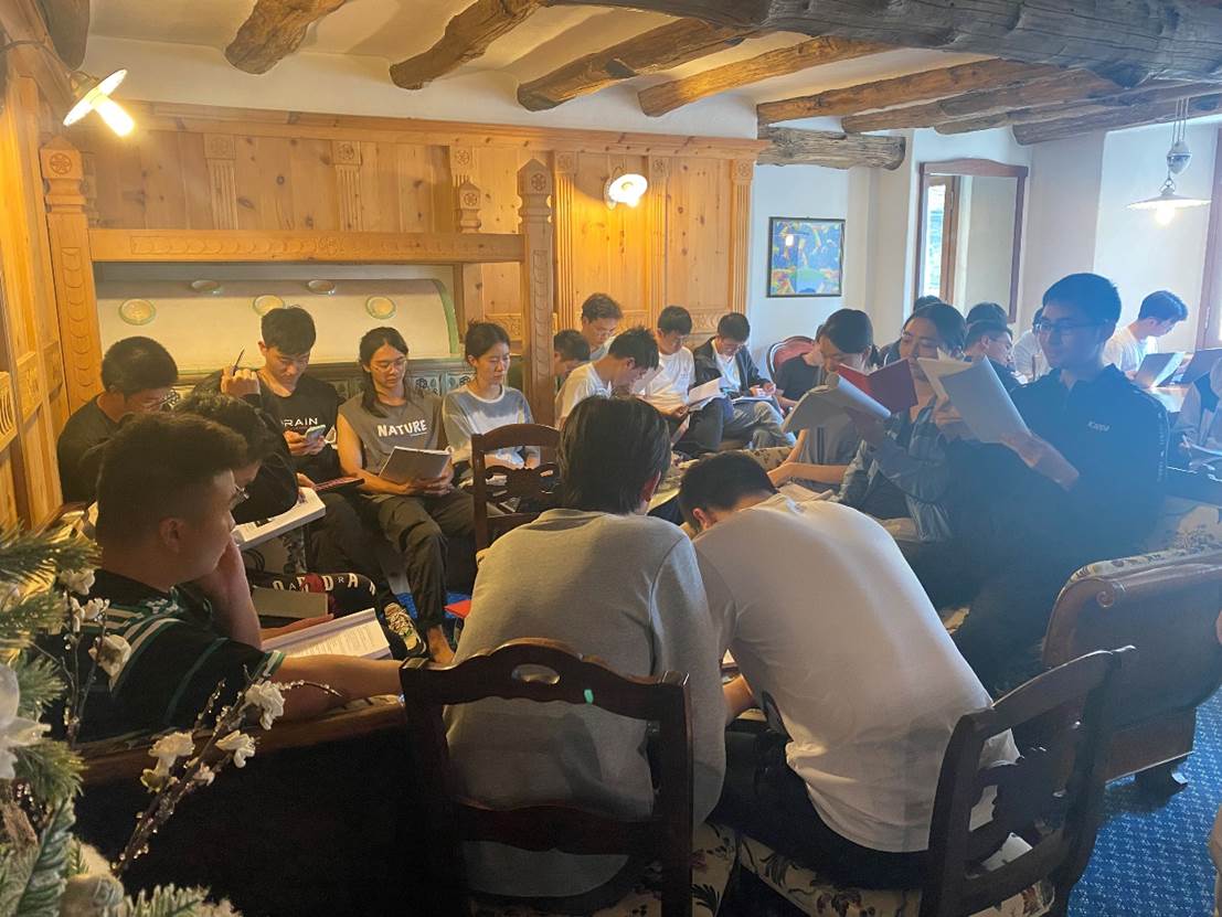 在Real Alps的野外观察结束后,同学们回到了住处,结合野外路线的测量与探勘,对较深层次的古环境古地理变化等问题展开了交流与探讨,同学们各抒己见,老师们也针对性地做出一些提问与解答。在这样的室内讨论中,实习队员们既通过野外的观察,对书本上的理论知识有了更加深入的理解,又结合在国内野外实习所学的内容进行对比,拓宽了国际化视野,更好地体会了地球科学领域的全球构造演化格局,对于未来同学们的科学研究大有裨益。