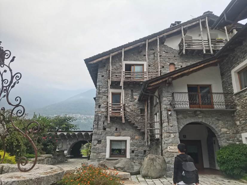 10月5日的清晨,迎着米兰的朝阳,实习小队启程前往阿尔卑斯山深处的Val di Mello开启一天的实习工作。Val di Mello这里山势陡峭,景色优美,是夏季的攀岩和旅游胜地。沿途,我们参观了此处的教堂、房屋。从教堂里所用的黑色与红色灰岩,到构成房屋墙壁的石料,甚至道路上不起眼的地砖,基本都取材于该地区周围的岩石。因此,通过观察这些建筑,我们也能管中窥豹,了解到Val di Mello的岩石构成及特性,同时让我们体会到了地质与生活、文化等诸多方面存在的联系。