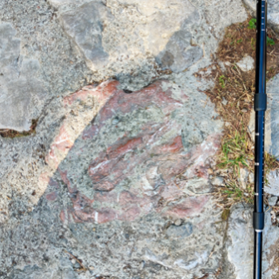 所谓“常看常新”,地学中更是如此,虽然观察路线与前一天的实习路线有所重合,但同学们却在路途中仔细观察,寻找并发现新的有趣现象。登山途中,可以看到铺路的石头中有着绿色的蛇纹岩转石,或是深海红色软泥形成的红色硅质岩,不同时代的岩石各有特点,他们或是停留在原地,或是经过后期冰川作用被搬运到附近,最终成为村民们上山路上的垫脚石,共同汇聚在一起,铺成脚下的斑斓。(图2)