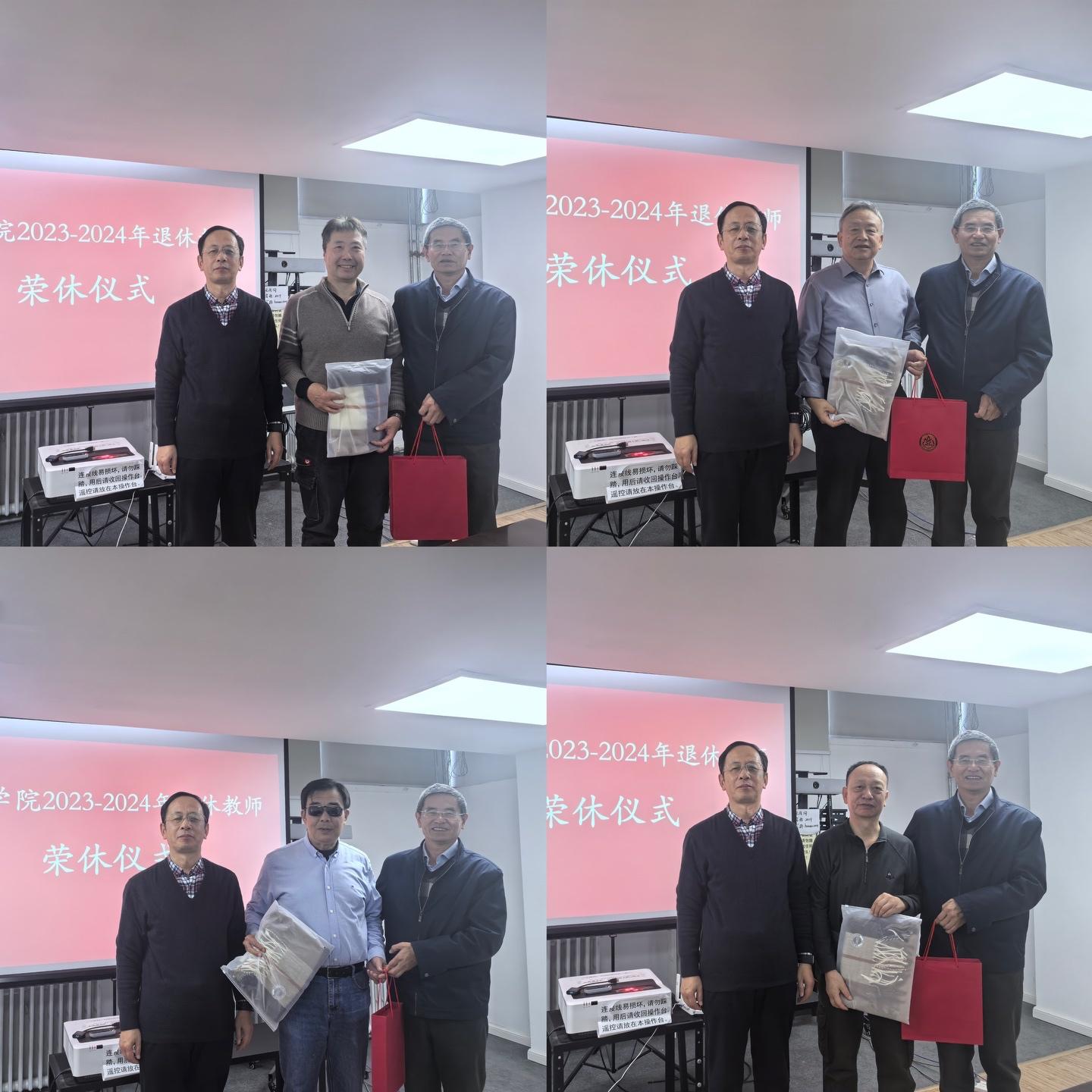 在资源西楼2419会议室举办2023-2024年退休教师荣休仪式。新退休教师关平、韩宝福、孙元林、陈鸿飞,以及学院领导班子成员张立飞、李培军、江大勇、宁杰远、陈云超出席会议。会议由江大勇主持。