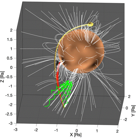 关于少数掠过太阳大气而幸存下来的掠日彗星(比如C/2011 W3掠日彗星),针对其无尘区的形成机制和喷气氧离子的动力学过程,何建森课题组开展相应的研究 (Hou, He, et al., 2021)。他们在太阳日冕磁流体力学模拟的基础上,加入两种带电粒子(尘埃粒子和氧离子),分别模拟尘埃带电粒子和氧离子从彗星释放后在日冕中的受力和运动过程。研究发现日冕磁场普遍存在的磁镜结构,能够在日心距离2个太阳半径的地方有效反射尘埃粒子,使得尘埃粒子还没完全熔融热解就受力反弹,从而形成无尘区。针对氧离子的导心运动的模拟表明,氧离子的导心漂移运动在日冕环境中主要由太阳风源区的电场漂移占主导,而磁场不均匀性的梯度漂移和曲率漂移则是次要的。由此,作者提供一个建议,即可以利用掠日彗星的彗尾变形来推测日冕磁场拓扑形态的改变。