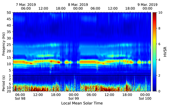 该研究采用地震学时频分析方法,对多个连续火星日内的火星表面地震背景噪声数据进行了研究,其中包括了功率谱、振幅谱、水平垂直谱比等数据的分析,并结合地震仪的工作性能噪声和气象观测数据分析了背景噪声中主要能量的变化模式和可能来源。火星地震观测数据的频谱呈现多个日周期性变化的窄条带,它们的幅值和频率的波动与风速和气温的变化具有较强一致性。火星背景噪声的水平垂直谱比值具有日周期性变化和多峰两大特征。经过以登陆器振动作为源的数值模拟,解释了这两大特征主要由登陆器自振引起。利用极性分析研究峰谷频率附近的地面运动特征,显示谱比的高频部分的地面运动主要是位于水平方向的线性运动,且方位角比较固定。这些特征与由风驱动的火星登陆器的自振模式比较吻合。谱比的低频部分存在垂直方向强于水平方向的地面运动 (2.4 Hz mode),目前针对该信号的起源存在争议,该研究使用随机减量方法对该信号进行了衰减分析,确认来自高频范围的登陆器自振引起的机械振动拥有较低的衰减系数,而2.4 Hz mode的衰减系数明显更高,这一结果为该信号的自然源假说提供了可能的依据。对于部分已经探测到的火星震事件的谱比分析显示,没有发现明显的地下结构的自然响应。