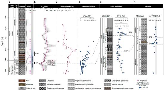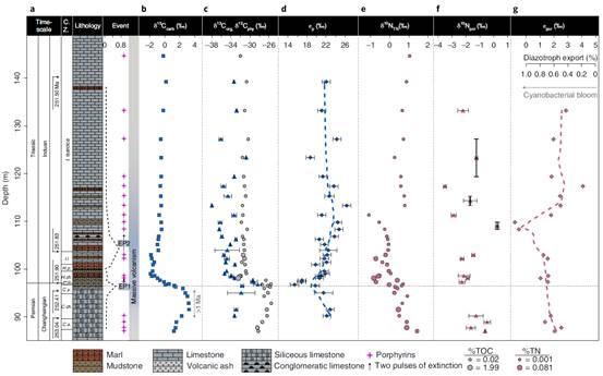 针对该时期的气候变化,沈佳恒研究员利用远古叶绿素的生物标志化合物单体碳同位素定量重建了该时期的大气二氧化碳浓度(图12)。重建结果显示第一幕灭绝,pCO2最低;随后pCO2快速上升,步入缓慢上升期,此高pCO2一直持续至早三叠世的第二幕灭绝,并达到最高值;之后pCO2开始缓慢下降。此重建结果详细刻画出了两幕灭绝时不同的pCO2特征。生物标志化合物单体氮同位素被用于定量重建该时期海洋初级生产力群落结构(细菌及真核生物)的演化(图12)。重建结果显示第一幕灭绝时,海洋初级生产群落以真核藻类(eukaryotes)为主;而第二幕灭绝时,蓝细菌(cyanobacteria则以绝对优势~100%全面占据海洋初级生产群落。