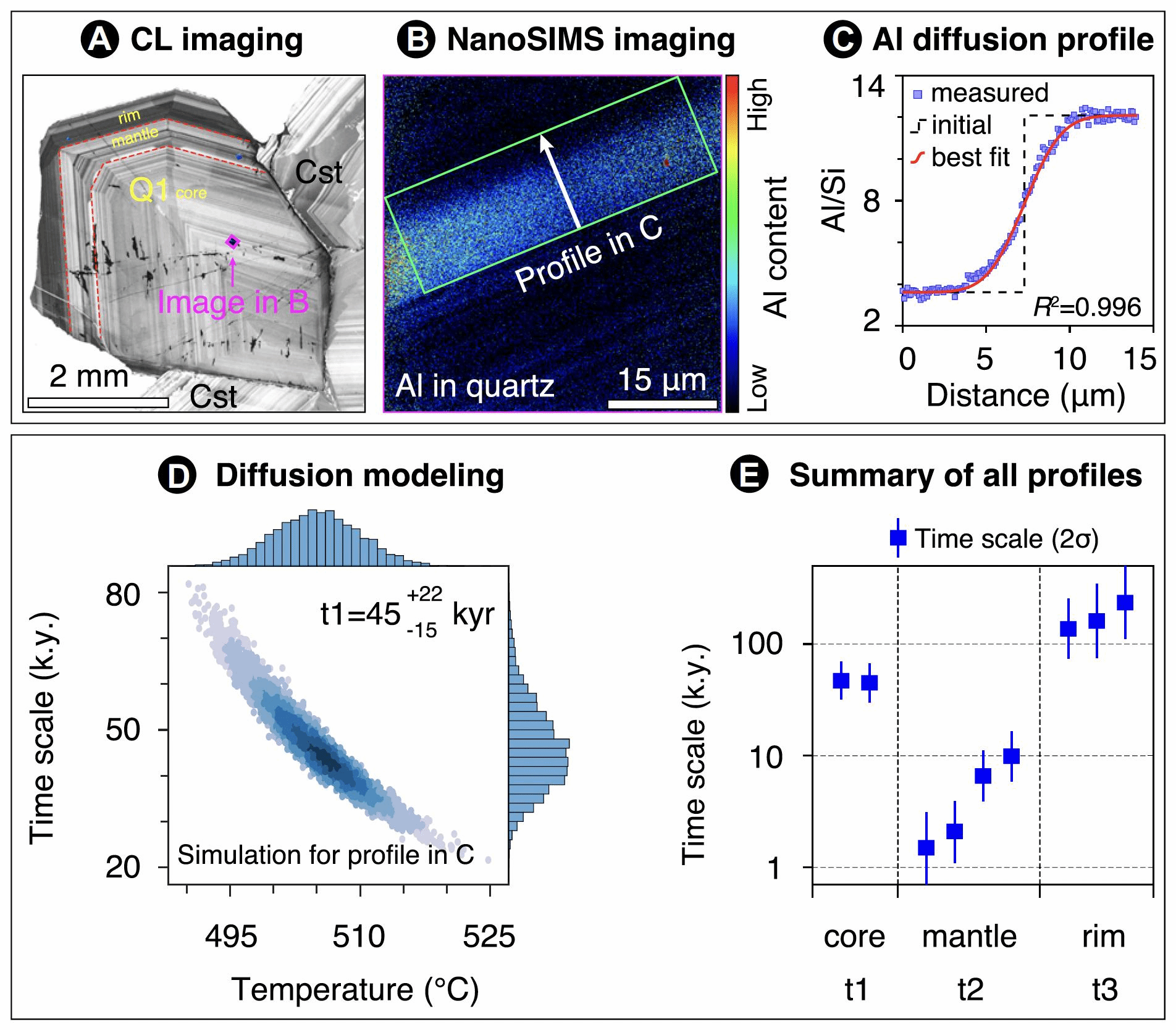 2, 通过微区分析技术实现成矿过程的高时间分辨率解析。(A),石英和锡石的阴极发光图像约束矿物生长历史与共生关系;(B)纳米离子探针石英Al含量分布成像;(C)石英Al扩散曲线拟合;(D)石英Al扩散年代学模拟计算;(E)热液体系不同阶段的时间尺度。