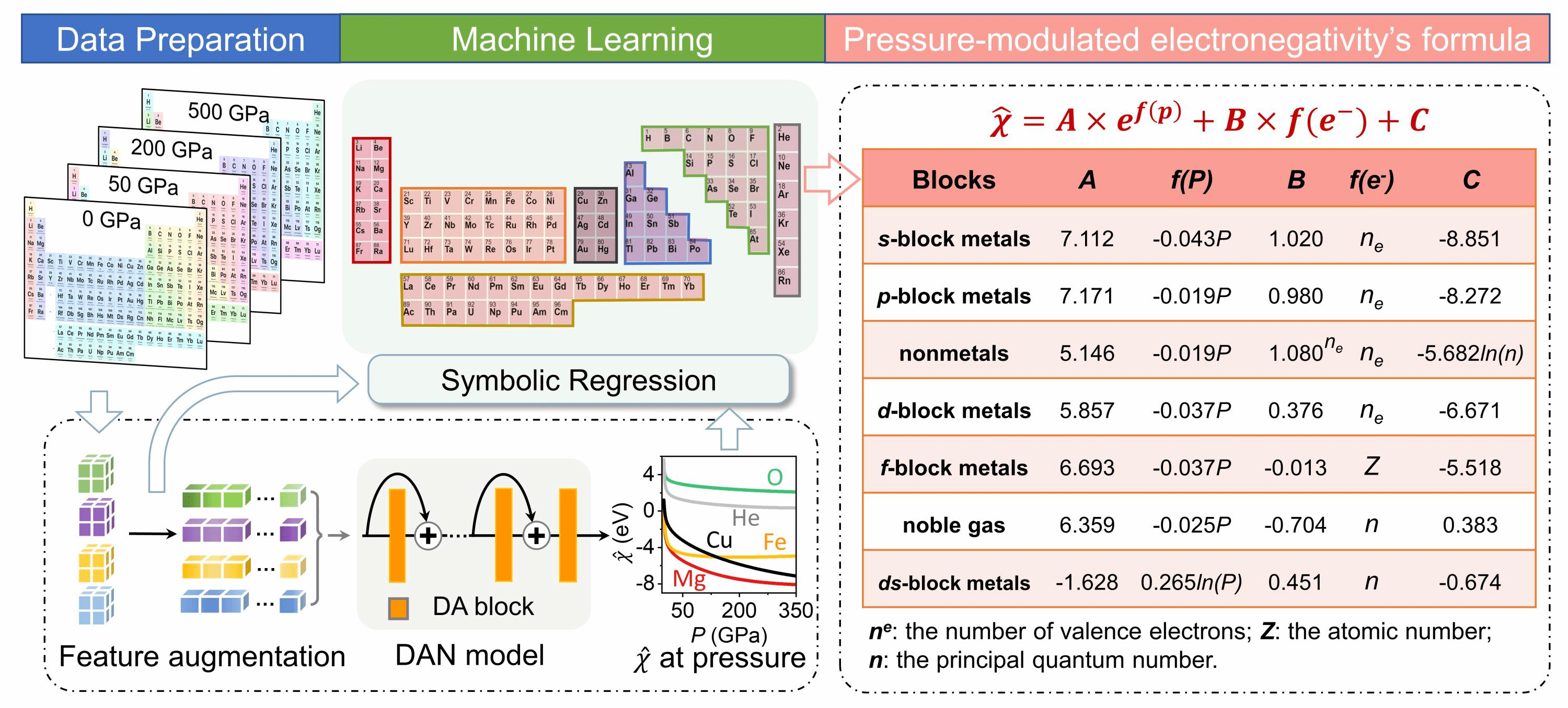 图1深度学习预测0~500 GPa任意压力下96种元素电负性,基于符号回归算法建立其随压力与电子构型变化的函数解析式