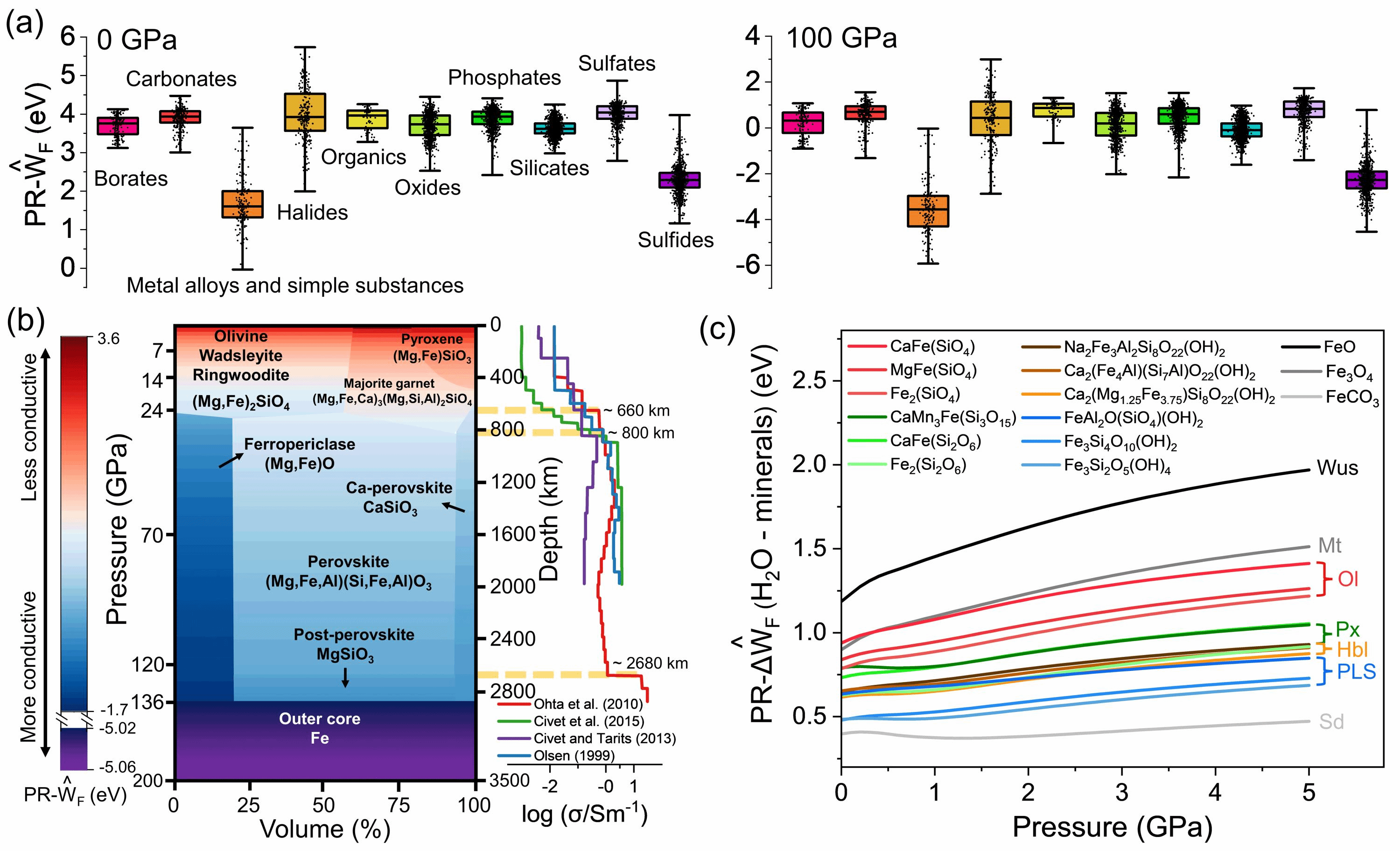 图2基于矿物受压力调制的相对功函数,揭示矿物化学组成及其电子构型特征调控界面价电子转移的定量规律。(a)矿物功函数值随化学组成与压力变化;(b)利用矿物功函数解释地球深部地质体电导率随深度增加而增大以及不连续面高电导率异常现象;(c)利用矿物功函数预测不同压力下含Fe(II)矿物与H2O之间的电子转移活性顺序。