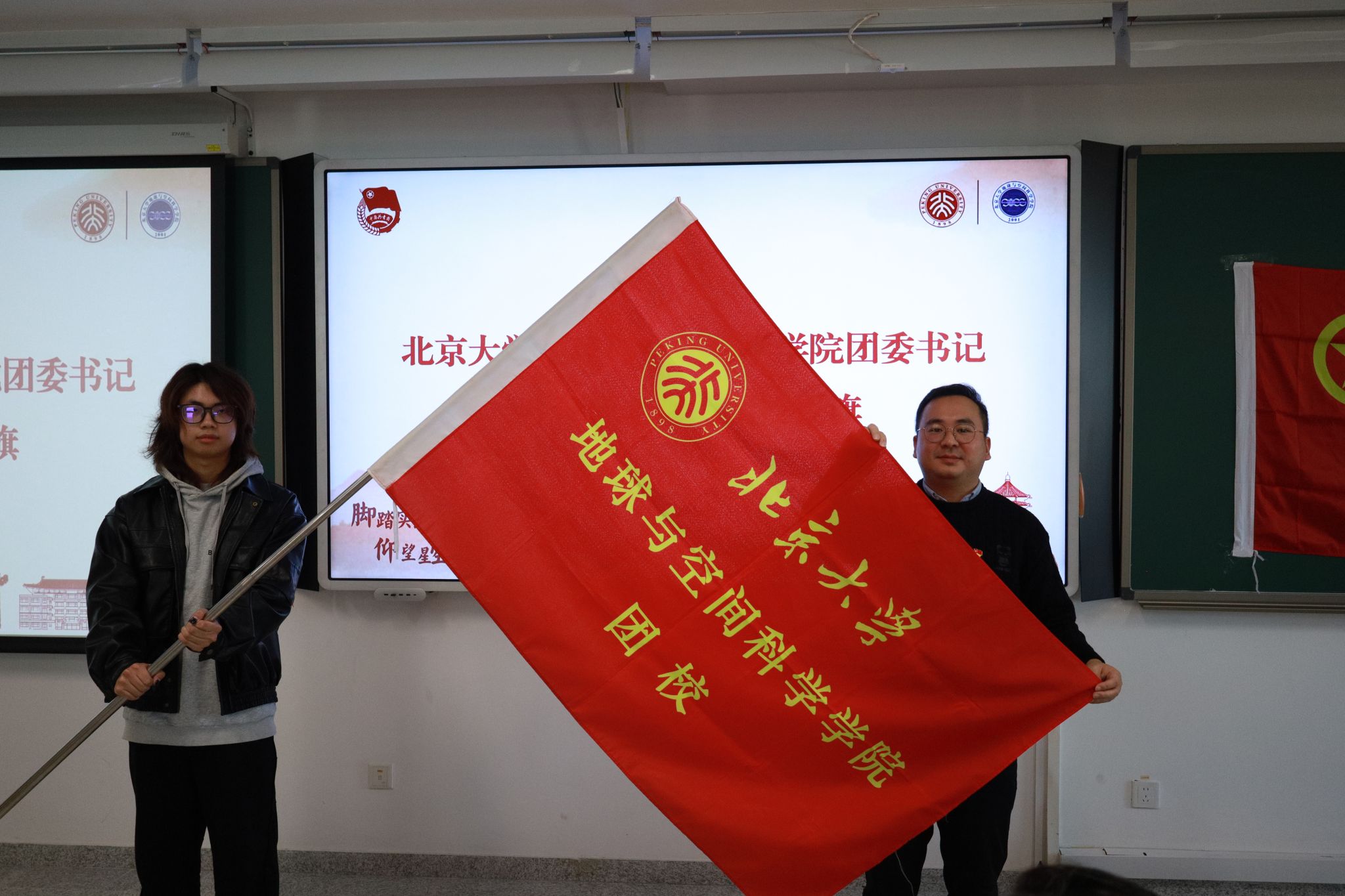 叶茂源为地空学院2025-2026学年团校授旗,团校秘书长包涵代表接旗,地空学院2025-2026学年团校正式开学。