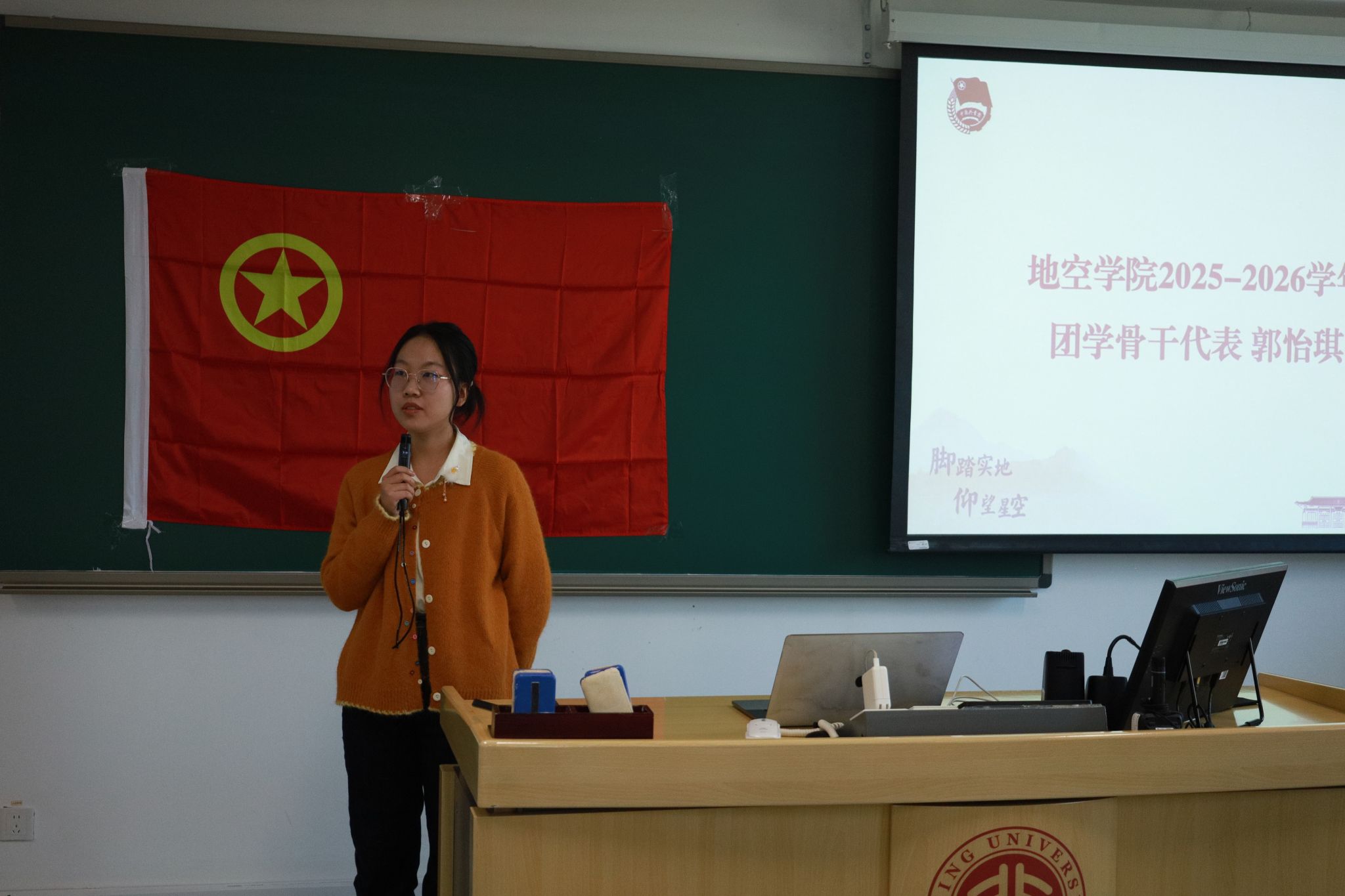 典礼在庄严的国歌声中拉开序幕。地空学院团校秘书长庞萃芸、刘云凯汇报了地空学院2024-2025学年团校工作总结与2025-2026学年团校培养方案。新一期团校将继续延续往期团校的优良传统,构建“五育并举”的人才培养体系,不断拓展实践育人的空间和阵地,开设“学科前沿”“劳动实践”“美育涵养”等丰富多彩的课程模块。