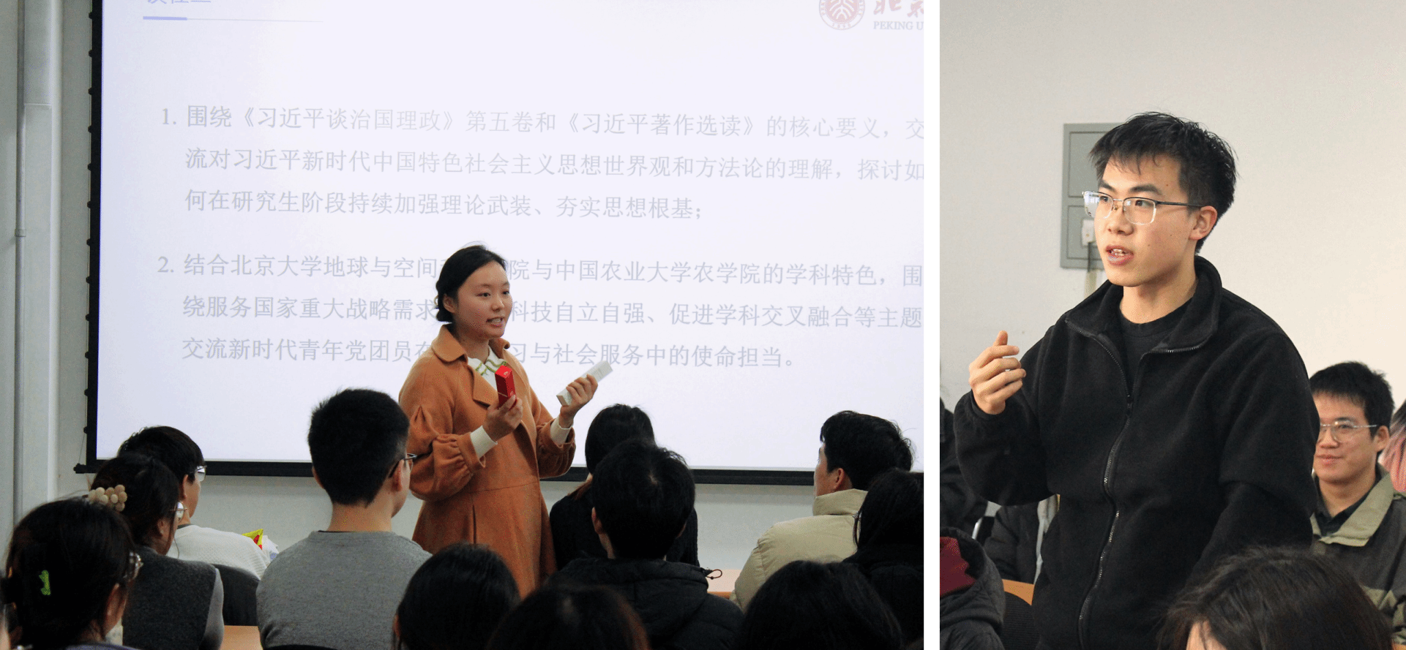 在集体讨论环节,与会党团员结合专题学习内容,围绕习近平新时代中国特色社会主义思想的世界观和方法论展开交流。此外,大家了解到中国农业大学的“科技小院”模式,通过“高校-政府-企业-农业”多元协作机制,有效推动了科技创新与农村发展的深度融合。地空学院史前生命与环境研究生党支部书记潘月涵表示,党支部将积极探索“科技小院”的工作模式,进一步深化校际党支部共建,推动党建工作与科研发展的双向融合。