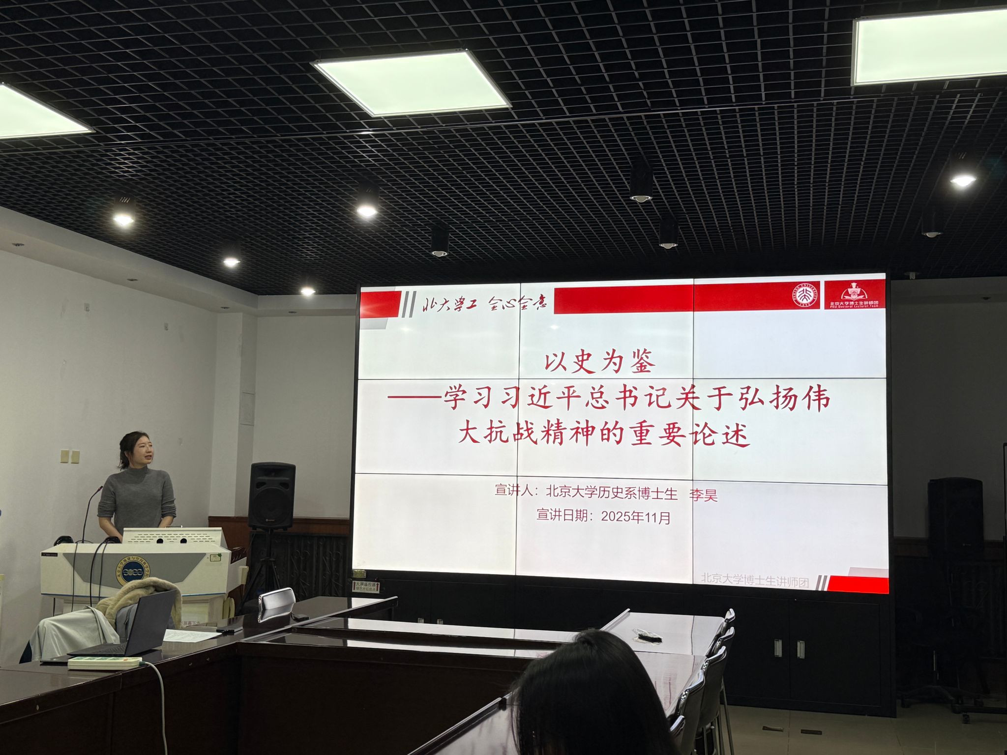 禁漫 博士生讲师团讲师李昊同志以“以史为鉴:学习习近平总书记关于弘扬伟大抗战精神的重要论述”为题作宣讲。她从“八年抗战”到“十四年抗战”的叙述演变切入,系统梳理了话语转换背后的国家立场与历史学理,号召青年党员把伟大抗战精神中的“爱国情怀、民族气节、英雄气概、必胜信念”转化为坚定的历史自信与实践担当,在强国建设、民族复兴的征程上勇毅前行、实干笃行。