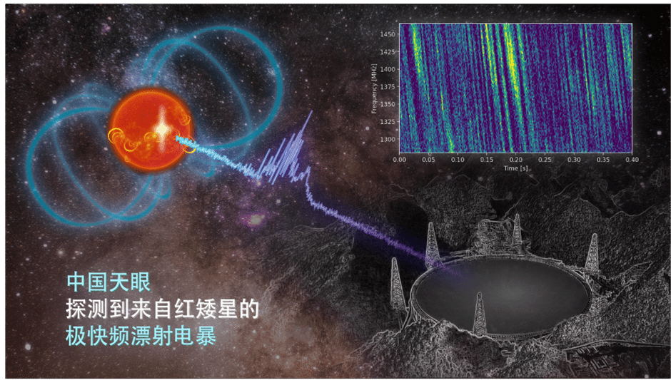 以北京大学地球与空间科学学院田晖教授及其博士生张佳乐为主的合作研究团队在恒星磁活动方面取得重要进展。利用“中国天眼”(即五百米口径球面射电望远镜FAST)高灵敏度、高分辨率的射电观测,该团队在M型恒星AD Leo上探测到一种新的毫秒级射电暴,结合恒星表面磁场测量数据,他们认证出该神秘电波来源于恒星黑子区域的小尺度磁场。该工作填补了我们对太阳系外恒星小尺度磁场认知的空白,对于揭示星冕爆发的机制、推动太阳系外的空间天气研究有重要意义,相关工作近日发表在国际学术期刊《科学进展》(Science Advances)上。