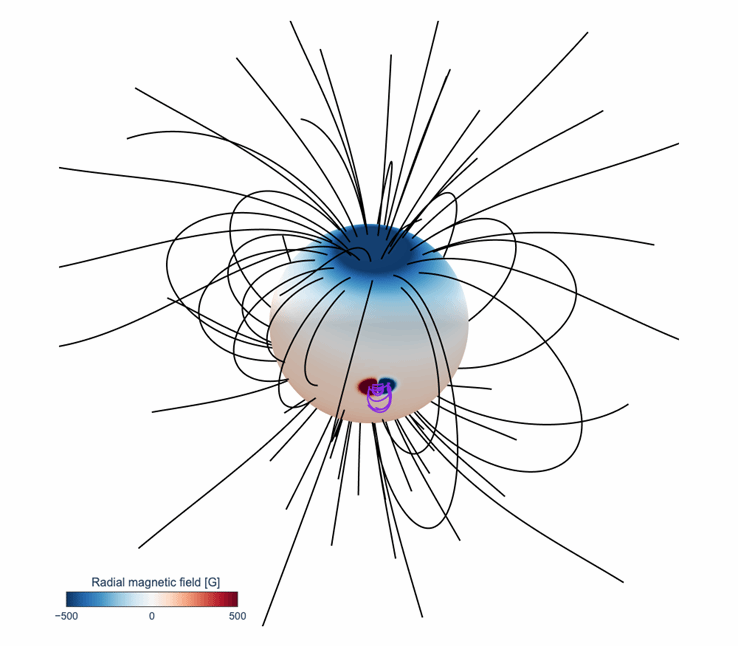 图 2 AD Leo三维磁场外推模型,中间为恒星表面径向磁场强度,黑色磁力线展示的是全球大尺度磁场,紫色磁力线展示的是黑子区域的小尺度磁场(射电辐射源区)