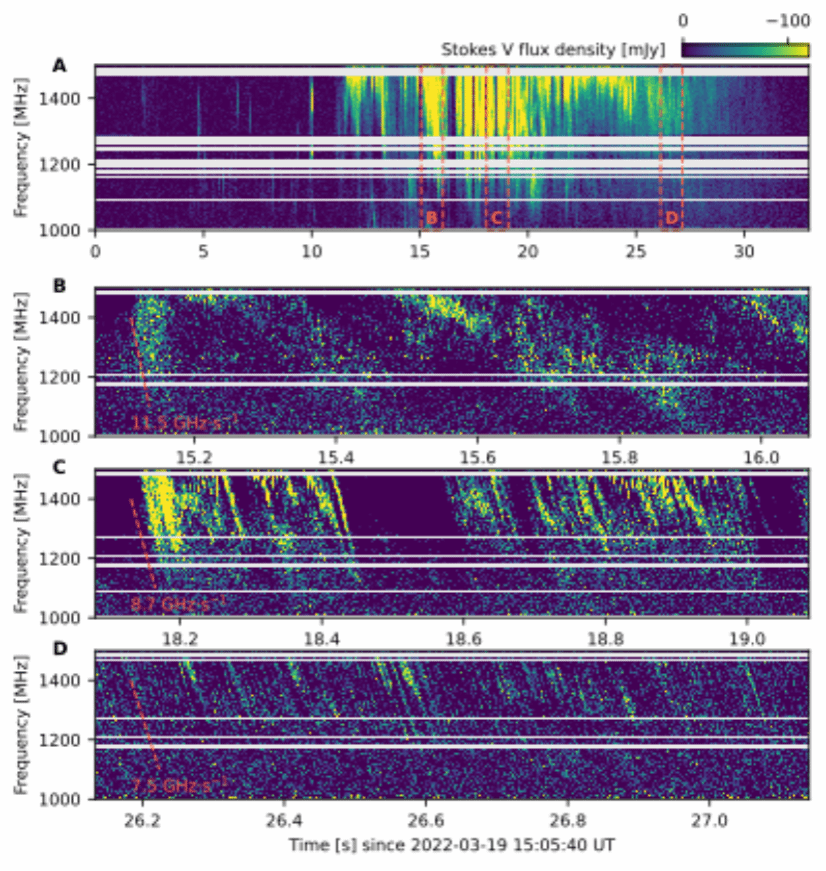 图 1 M型恒星AD Leo射电暴动态频谱图(A)及其精细结构(B,C,D)
