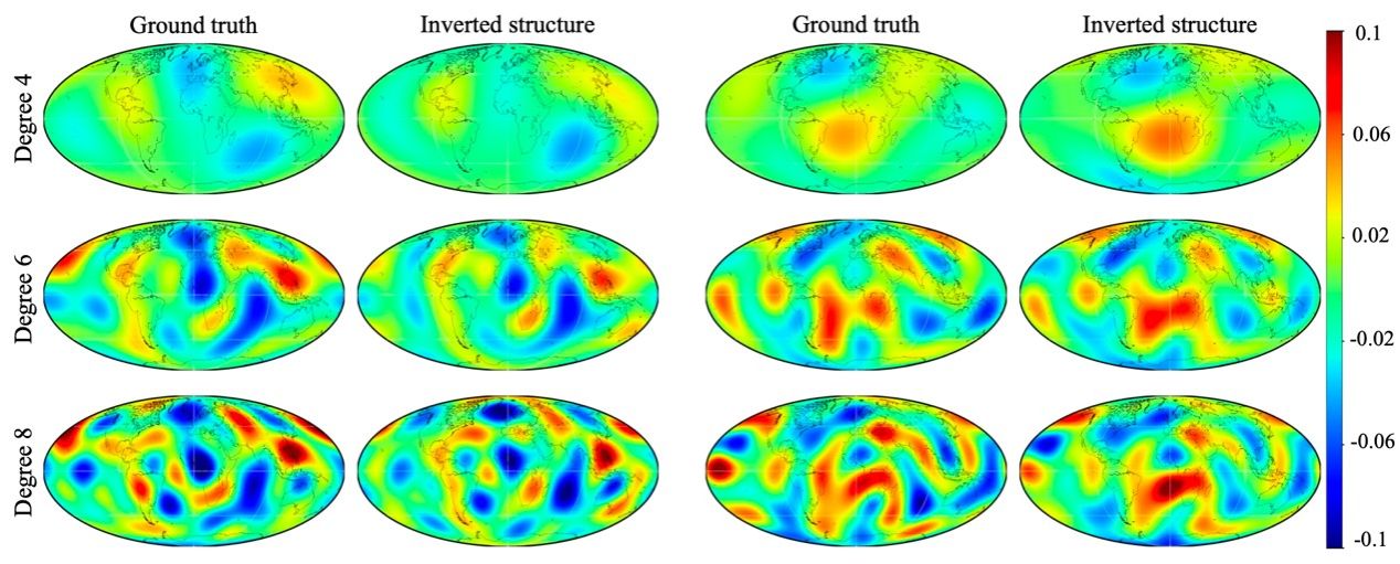 图 2合成测试结果。在地球内部结构球谐表征下,利用新的人工智能全波形反演层析成像框架可以很好地恢复三维模型输入,较传统基于数值模拟的算法加速数万倍。