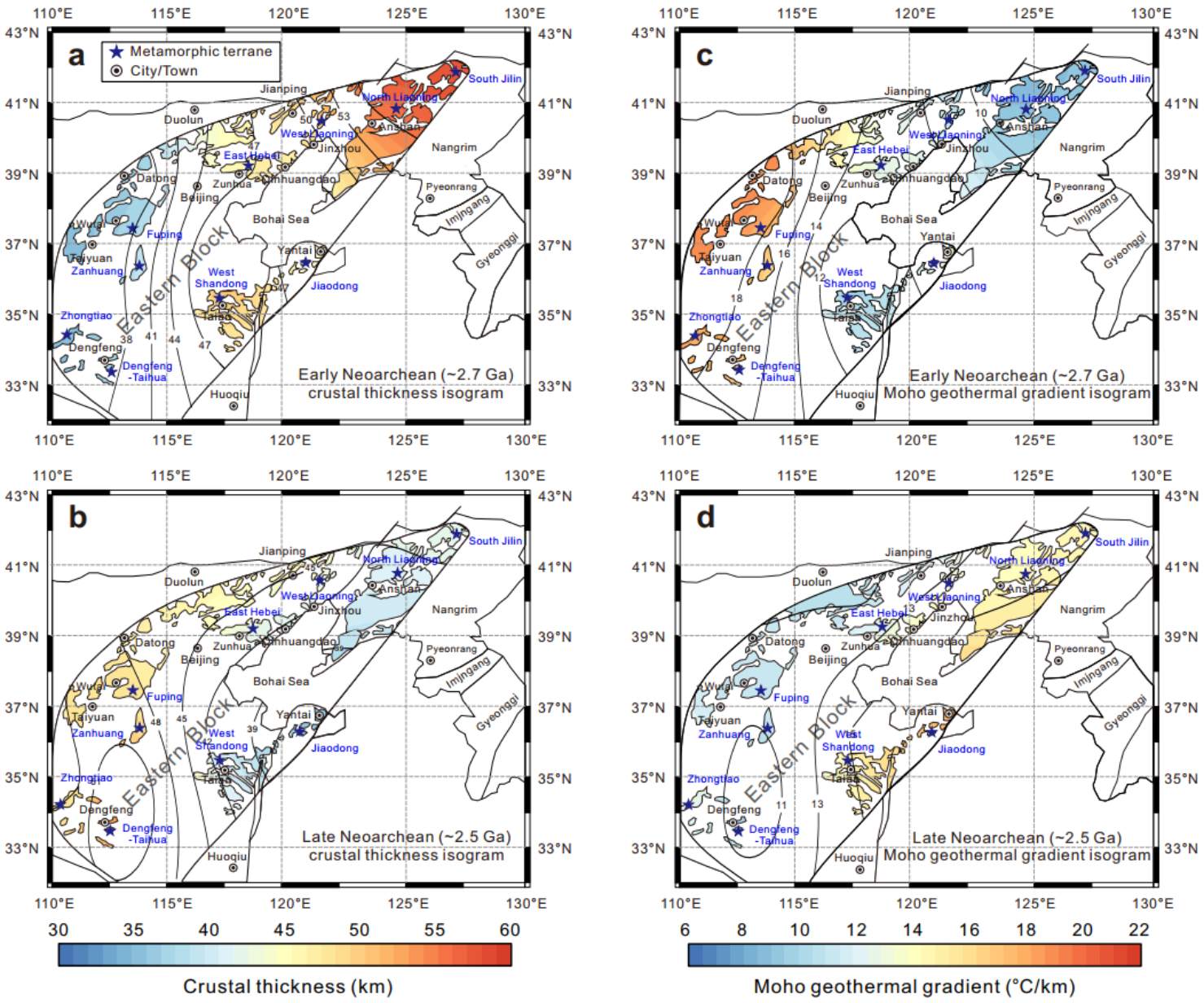 图1 华北克拉通东部不同时期地壳厚度和莫霍地热梯度的等值线图
