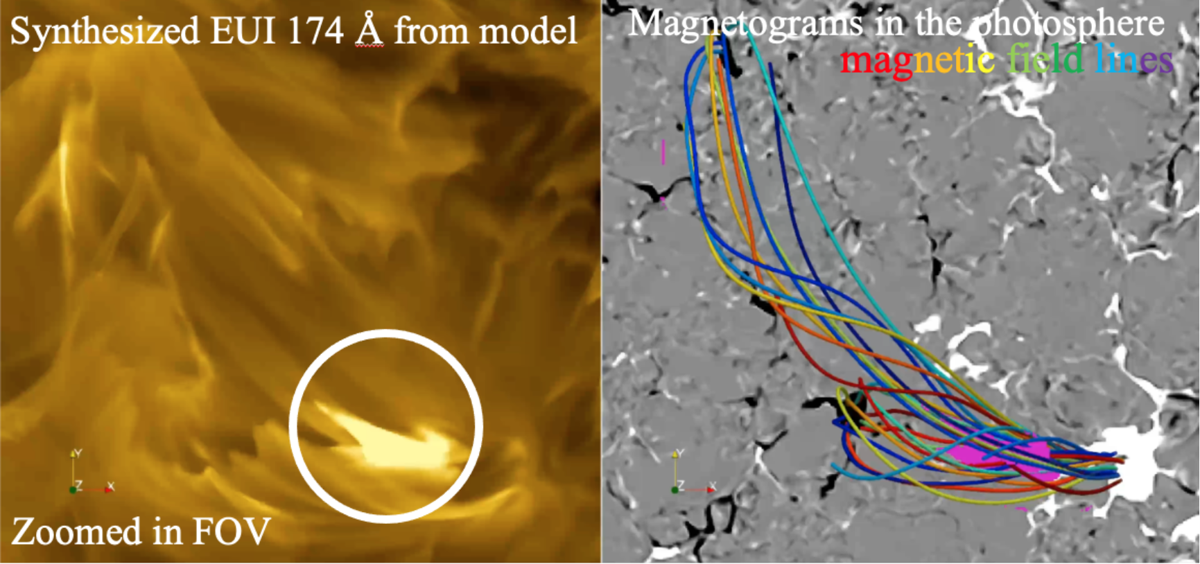 图2 左图是模拟的日冕图像,圆圈指示了一个类似“篝火”的事件。右图背景是太阳表面的磁场,粉红色代表左图展示的“篝火”位置,不同颜色的曲线表示其附近的磁力线(Yajie Chen et al. 2021, A&A)。