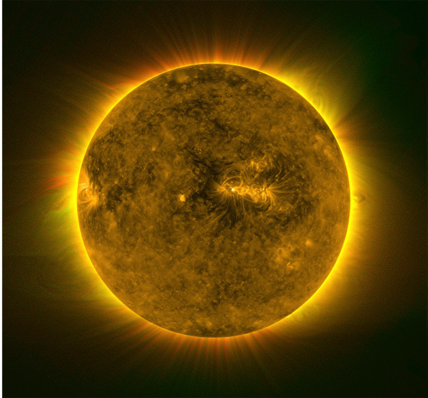 拍摄的日冕红线图像与云南天文台拍摄的日冕绿线图像、美国SDO卫星拍摄的日面图像拼接而成的日冕图像(Chen, Tian, Su, et al. 2018, ApJ)