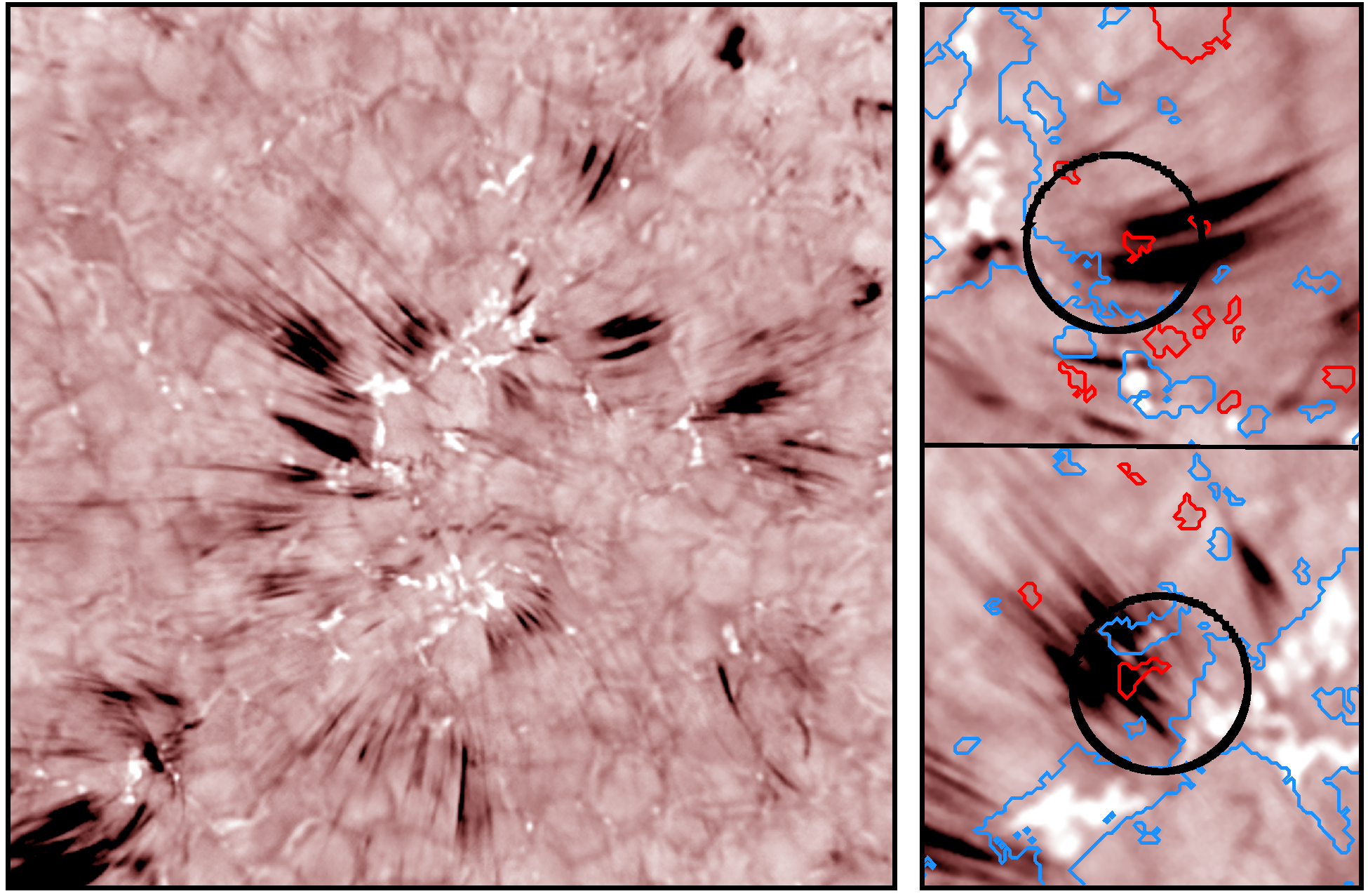 图4针状物与磁场演化之间的关系。左图为Hα谱线观测的针状物(细长的暗结构)。右图展示了针状物由相反极性磁场结构之间的相互作用所产生,蓝色和红色代表视向磁场分量的不同极性(Samanta, Tian, Yurchyshyn, et al. 2019, Science)