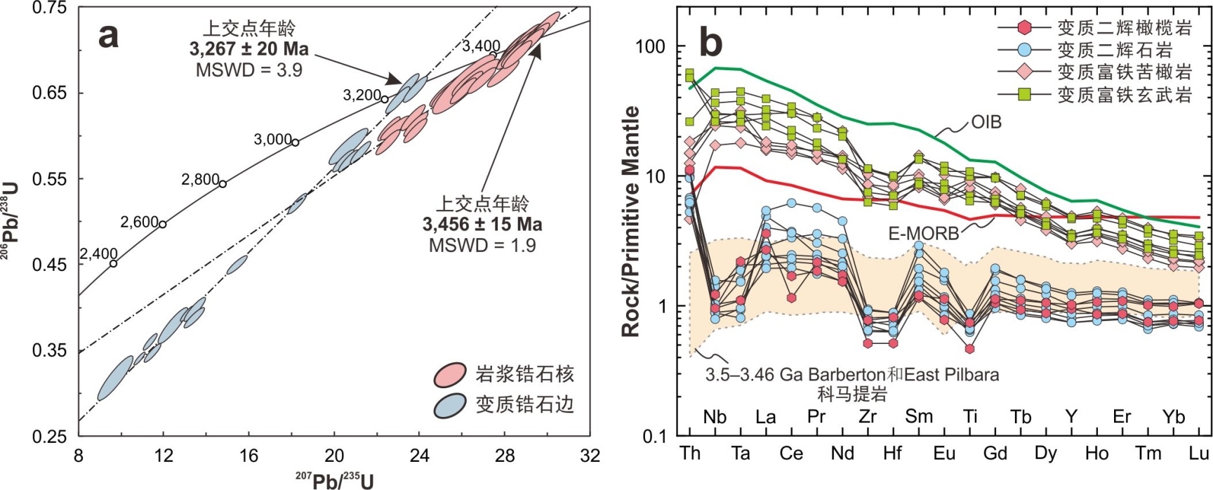 图(a)冀东古太古代超镁铁质堆晶岩锆石U-Pb谐和图解;(b)冀东古太古代富铁苦橄岩和超镁铁质堆晶岩微量元素蛛网图
