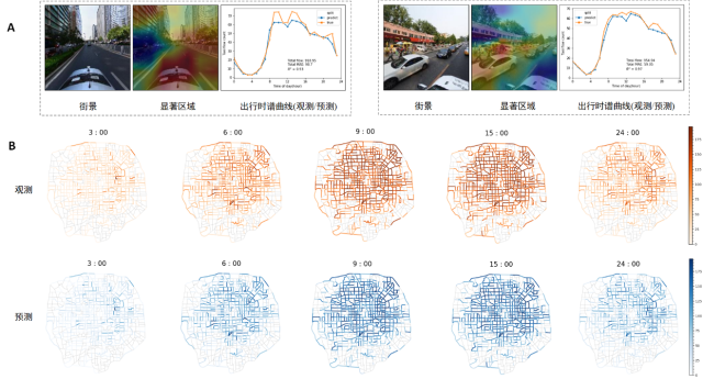 城市物质空间不但影响居民的情感体验,同时也蕴含了城市功能和居民活动等信息。但城市物质空间和社会空间之间存在多大程度的关联性,一直是有待回答的问题。研究利用街景表达城市物质空间,设计了一种基于深度学习的模型,来学习和预测每条街道上每小时居民出行的模式。发现仅仅根据街景图片,算法就可以还原65%以上的相关场所居民日出行活动的时空分布模式(图4)。该工作构建了连接物质空间与社会活动空间关系的桥梁,可以潜在地衡量建成环境与居民活动、社会经济水平发展之间的不均衡性,从而为城市设计与管理提供参考和决策支持。