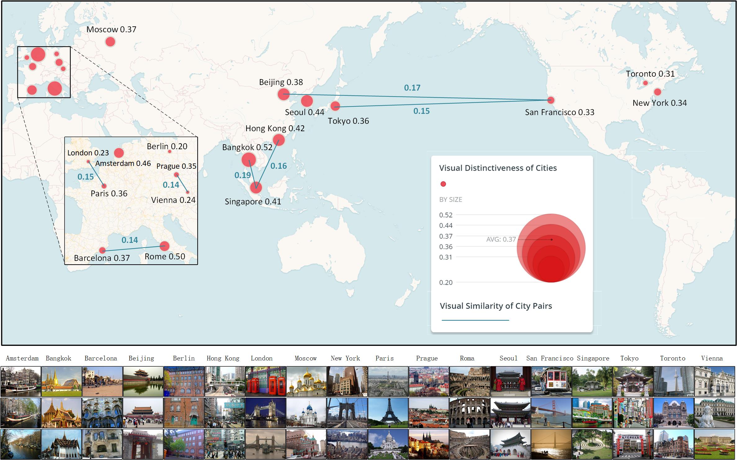 街景图像是观测城市物质空间的一种新型的大数据源,其观测视角更接近于人,所表达的内容也更为丰富。街景图像不但详尽地描绘了城市物质空间的组成(建筑物、道路、交通设施等),同时蕴含了大量有关城市功能和社会经济属性的信息。为了量化场所间物质环境的相似度和特异度,并挖掘每个场所中最有特色的场景,课题组提出了一种基于机器学习和混淆矩阵的方法。通过分析数百万张来自于社交媒体的城市街景照片,该研究计算了全球18个城市的城市景观特色程度,及城市间的相似程度,并挖掘出了最有城市代表性的照片(图1)。