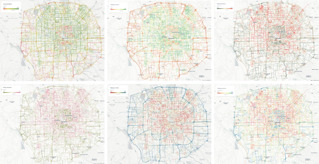 街景图像所表达的城市物质空间,在很大程度上与人们在城市中行为特征相关联。如何度量城市物质空间对人们情感体验的影响,进而为城市设计和规划提供决策支持?课题组利用机器学习模型,学习了来自于全世界几万名志愿者对数十万张街景的评分结果,实现了对任意自然场景的感知评分评估。图2所示为模型对北京五环内100万张街景图片,在安全感、生机感、压抑感等六个维度的评分结果。该工作从个体感知的角度提供了新的视角来观测城市空间的分异格局,为构建和谐、宜居环境提供方法支持。