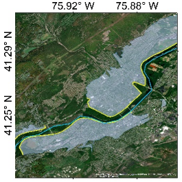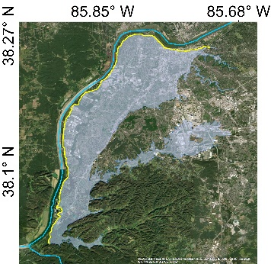 (黄色线条为堤防,淡蓝色阴影为堤防保护的洪泛区,从左至右区域分别为Larksville, PA; Louisville, KY; Chico, CA; Albuquerque, NM)