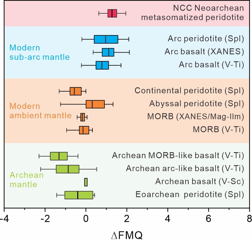 图2. 冀东新太古代俯冲交代橄榄岩、不同构造背景幔源岩浆和橄榄岩氧逸度对比图