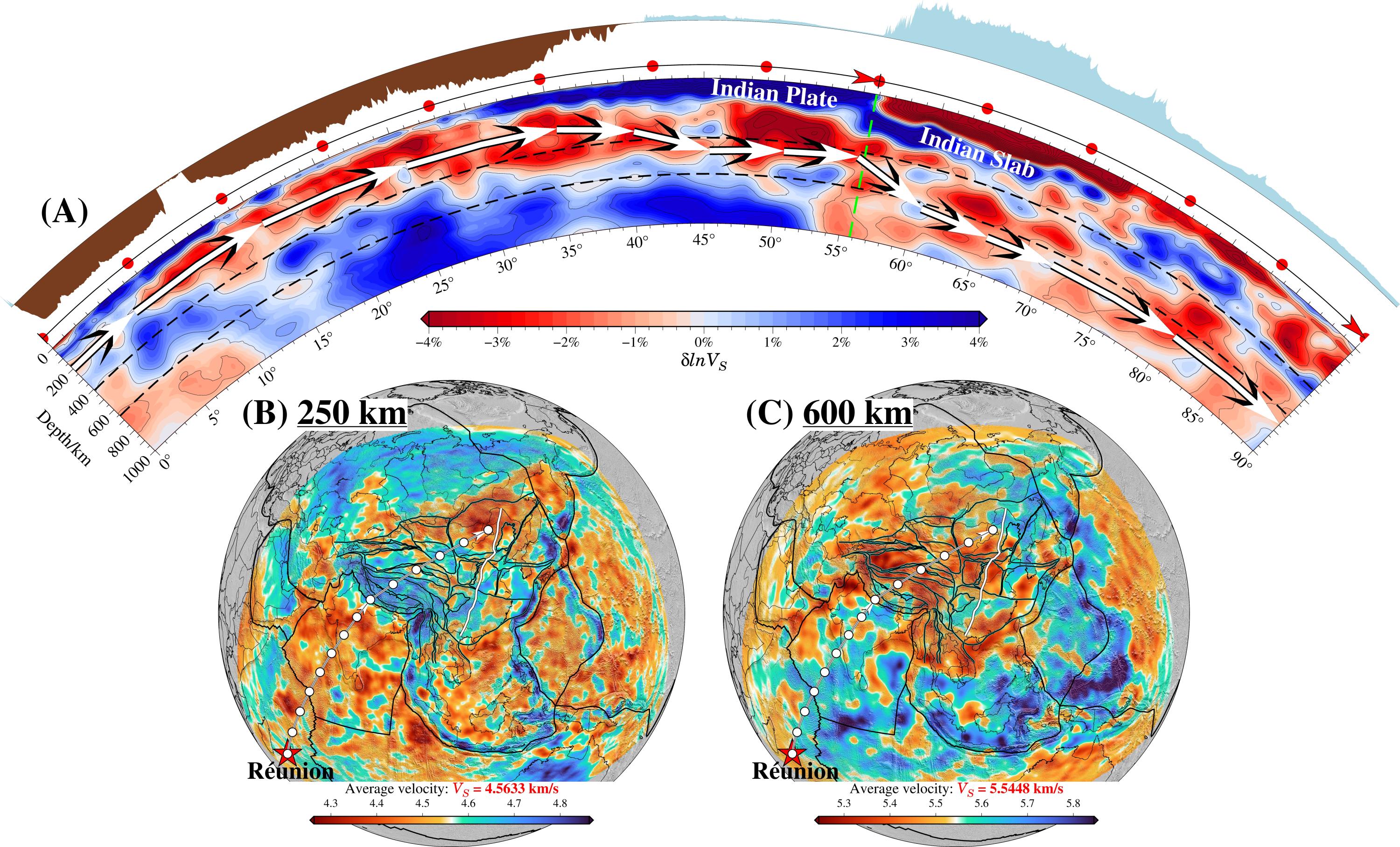 该研究用全波形层析成像所获得的模型显示,印度板块已经以低角度俯冲到几乎整个青藏高原之下,并在300公里深处呈近水平状停滞,这意味着俯冲的印度大陆岩石圈地幔已经演化到中性或正浮力,不再能够支持高角度的深俯冲;印度板片向北平板俯冲的水平距离从西(与塔里木岩石圈根碰撞处) 向东(位于松潘-甘子褶皱带以北,超越羌塘地块)逐渐增加; 亚洲岩石圈在青藏高原东北部下方向南俯冲,但并未与印度板片发生碰撞。厚度为50-110 km的大规模低速带夹在青藏高原地壳和俯冲的印度岩石圈地幔之间,与青藏高原的高海拔低起伏地形呈正相关,青藏高原保持其高海拔、低起伏地形的动力学机制归因于近水平俯冲的印度板片上方低速区的浮力。基于在印度板块以及俯冲的印度岩石圈地幔下方向北直到贝加尔湖-蒙古高原的大规模低速异常,我们认为,与留尼旺(Réunion)地幔柱相关的北向地幔对流可能是印度-欧亚大陆碰撞后持续会聚背后的主要驱动力。此外,地幔流向北超越了印度-欧亚碰撞区,一直延伸到贝加尔湖-蒙古高原,进而在南北重力梯度线以西地区引发了广泛的新生代陆内岩石圈变形。