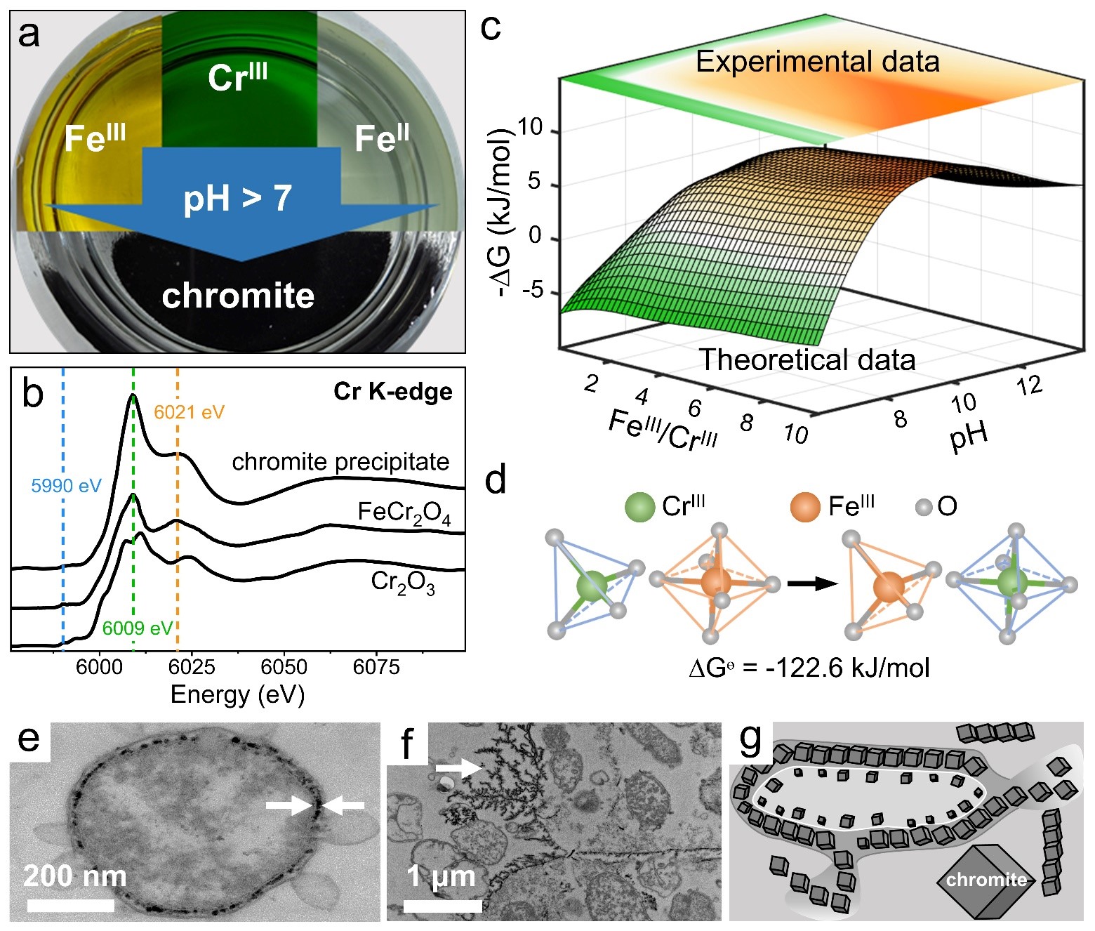 图1 铬铁矿形成的实验与机制。a: 常温常压下铬铁矿沉淀实物图;b: 同步辐射X射线吸收谱;c: 反应Gibbs自由能-pH-铁铬比三维模型;d: 四、八面体空隙离子分配反应;e: 微生物胞内与f: 胞外形成铬铁矿(白色箭头指向)的透射电镜照片及g: 示意图